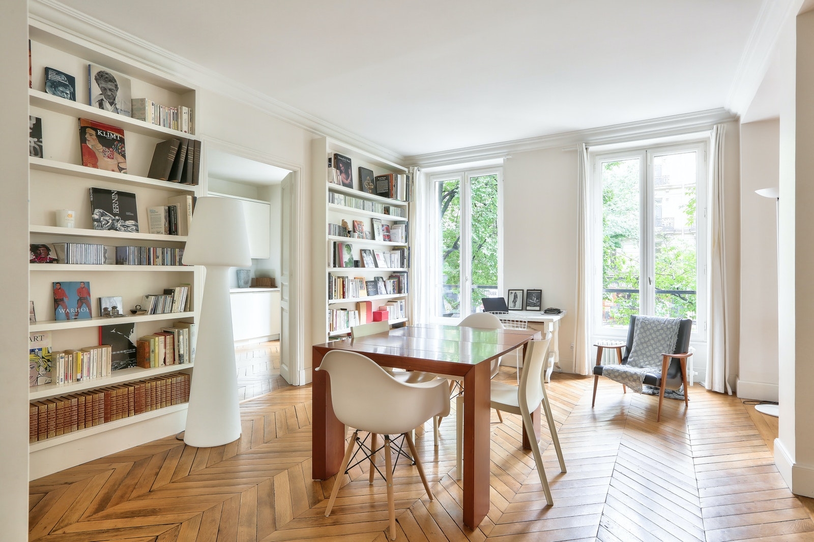 • Double salon, salle à manger de 60 m2 avec parquet, cheminée et bibliothèque