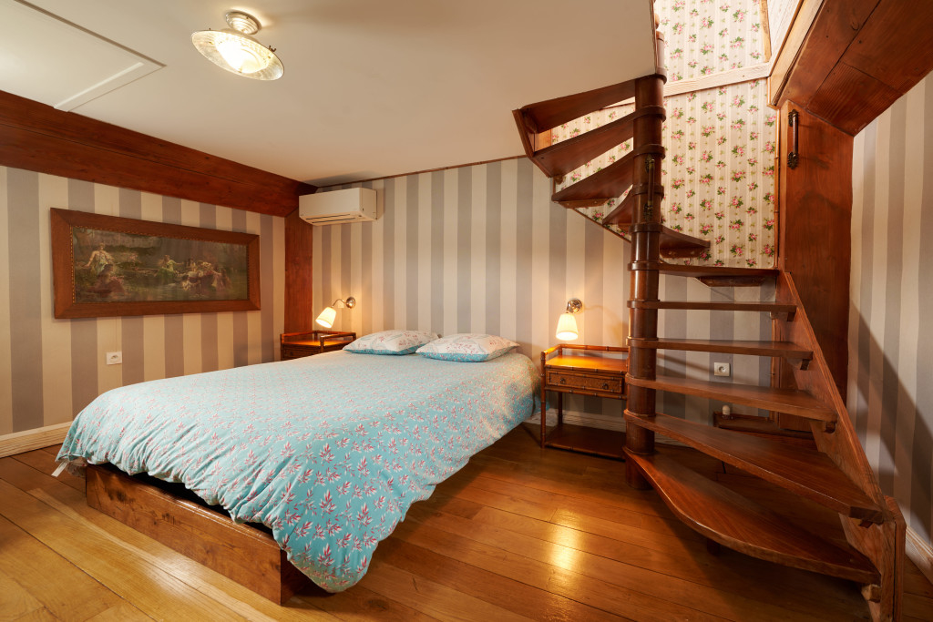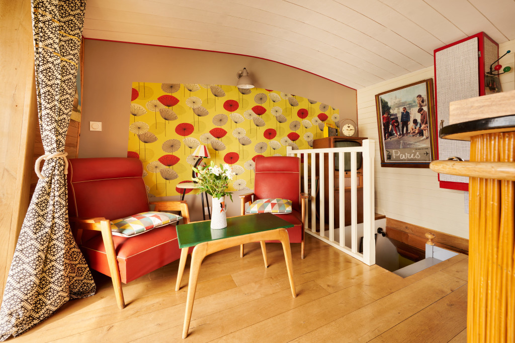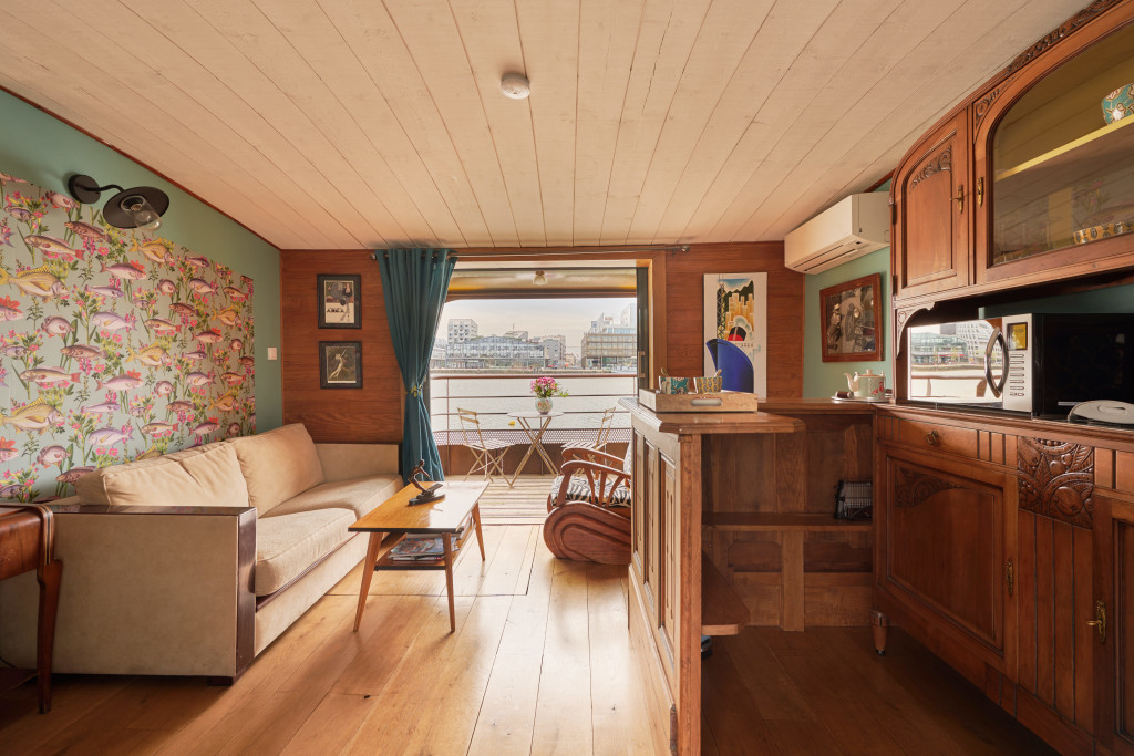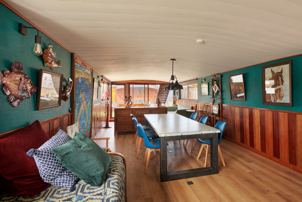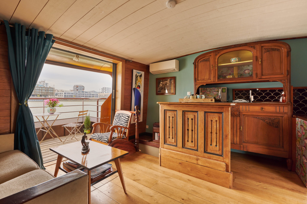 - le "carré du marinier" (environ 50m2) où l'ancienne timonerie fait office d'entrée dessert en haut, un salon, un espace repas, une cuisine ouverte, une petite terrasse et des toilettes et, en bas, une suite parentale avec salle de bain et toilettes.