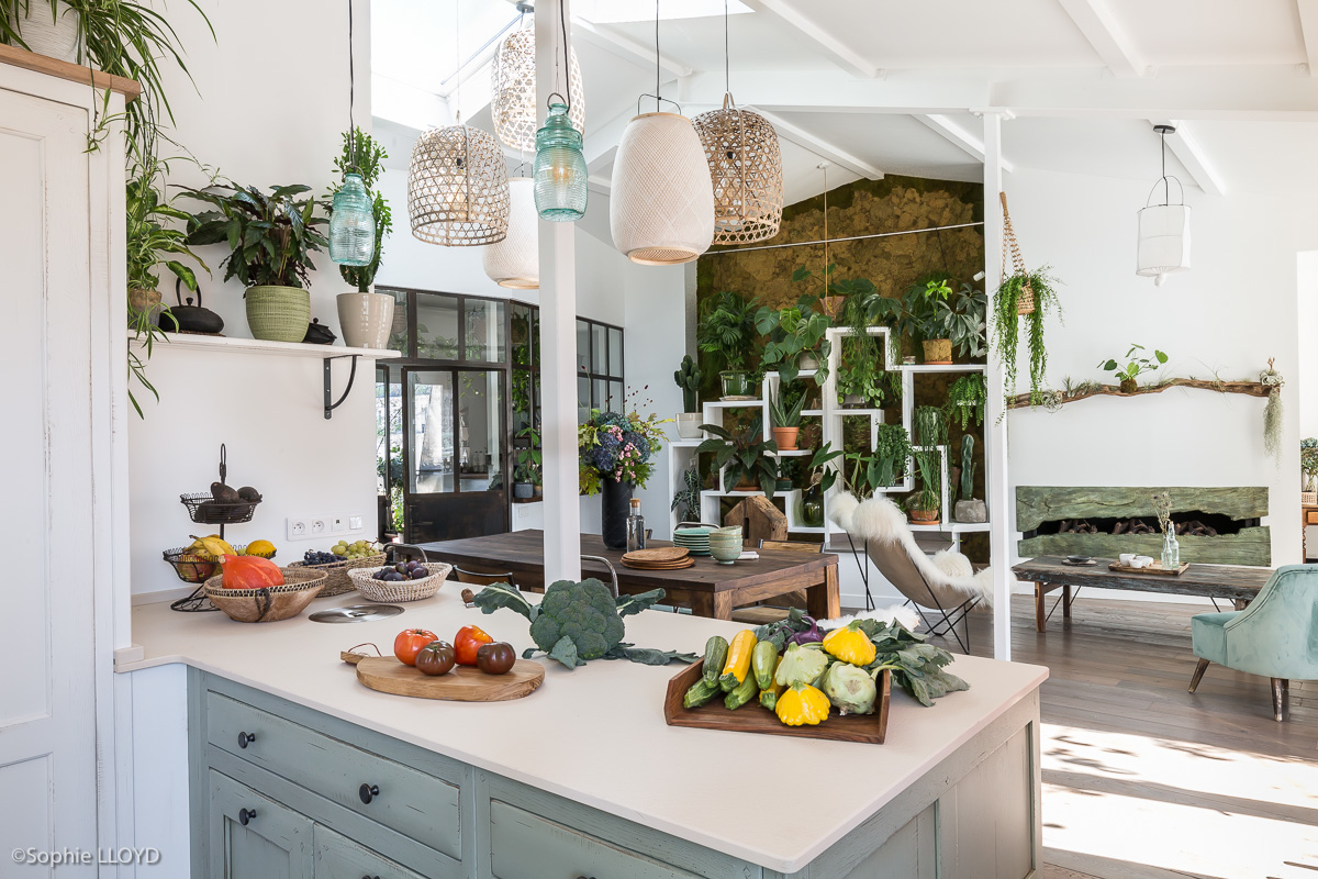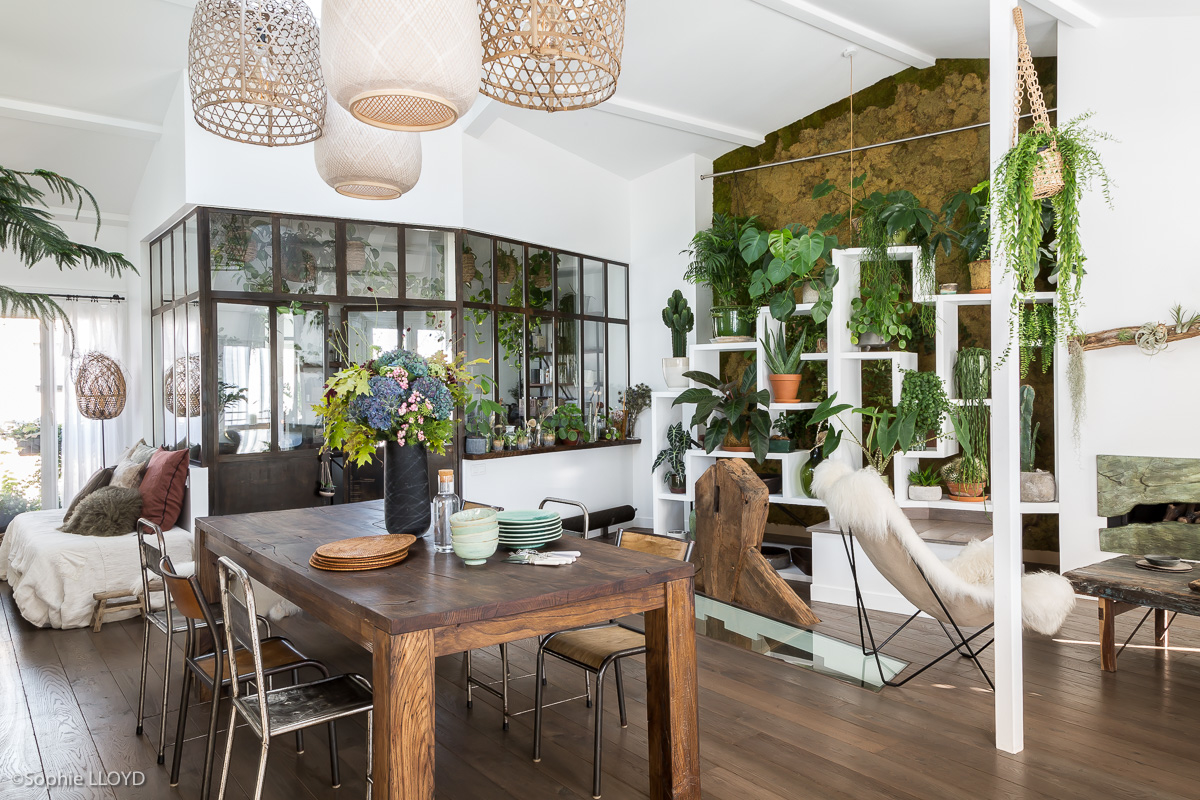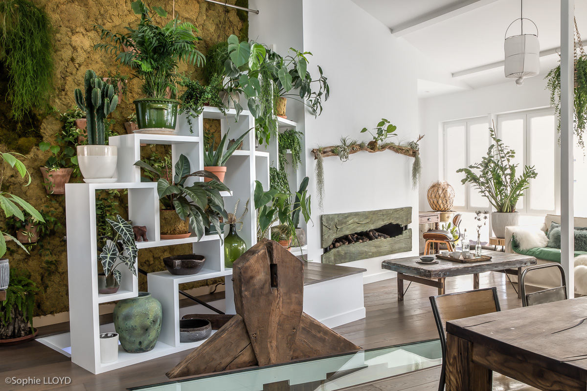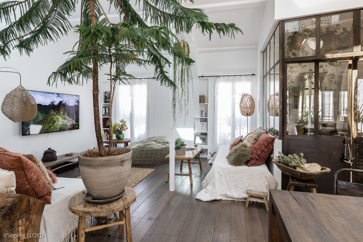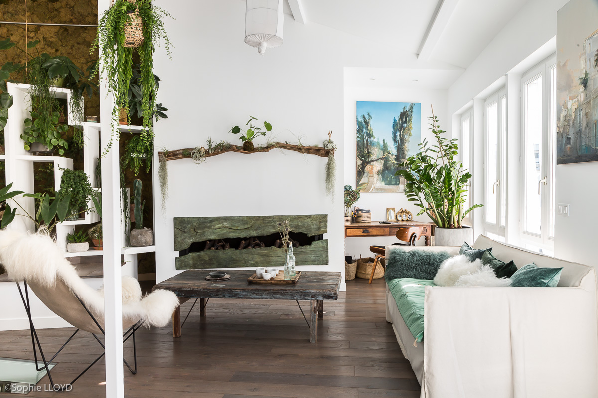Ce vaste séjour très lumineux, assorti d’une cheminée d’art, de bois bruts et d’étoffes, est une bulle d’oxygène rehaussé par la présence d’un véritable conifère.