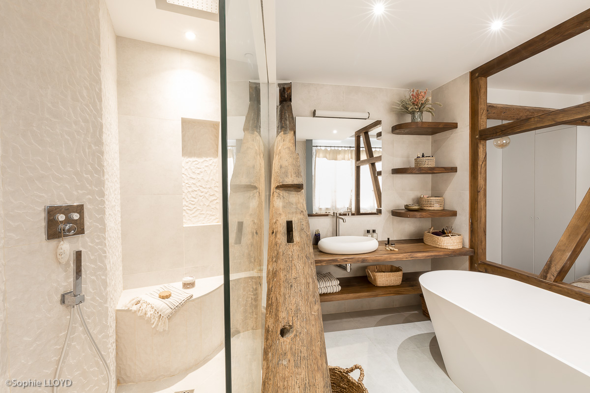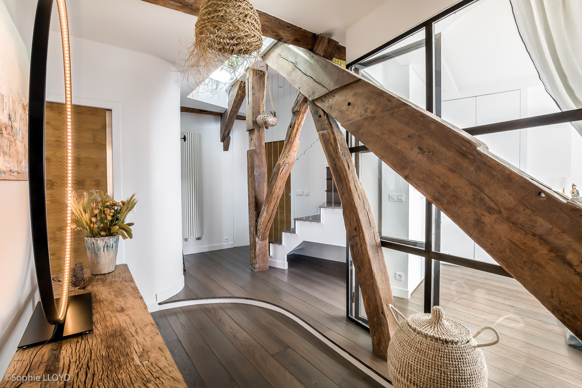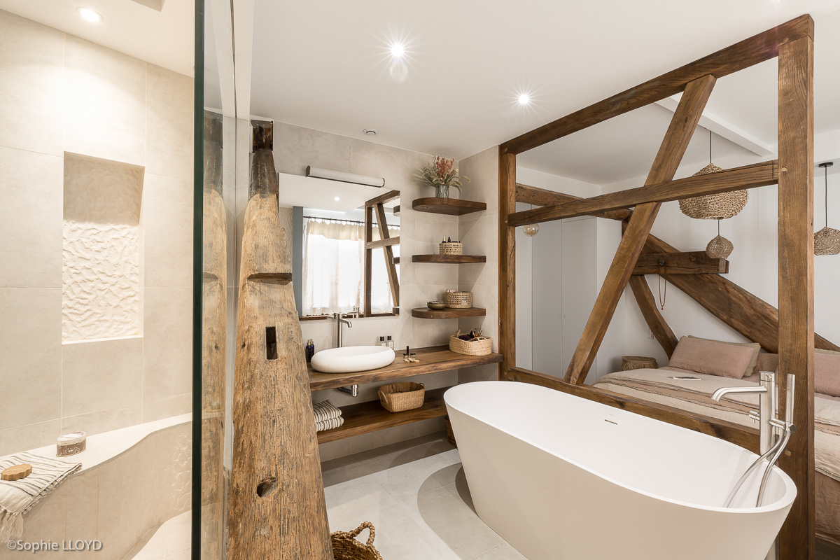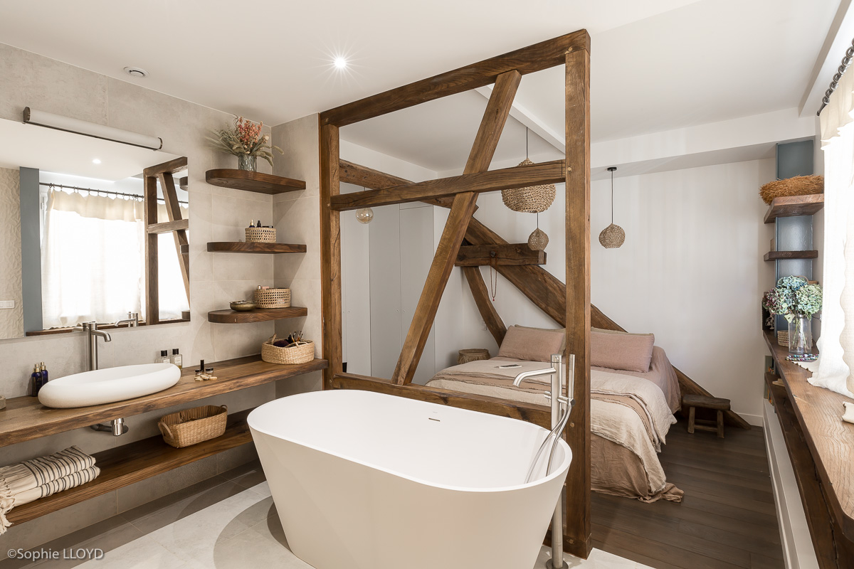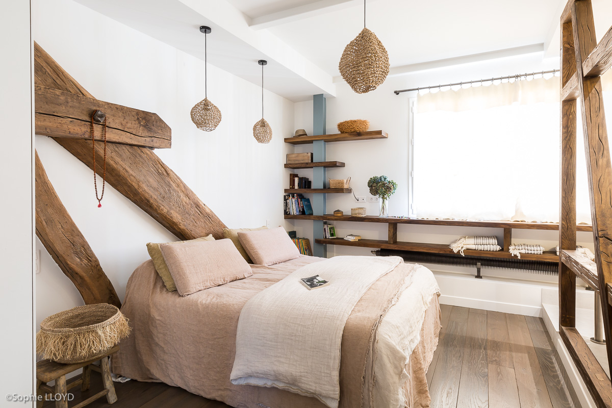 Le premier niveau accueille 3 chambres dont une suite parentale avec une salle de bain avec baignoire dans une ambiance boisée rustique moderne. Le niveau supérieur fait 100 m2 sous un plafond cathédral de 4m qui donne sur une petite terrasse végétalisée.