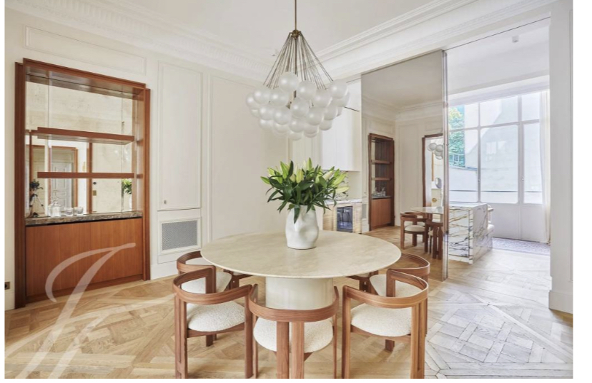 Dès l’entrée, on accède à la partie réception, composée d’un salon élégant doté de trois grandes fenêtres donnant sur l’avenue, d’un parquet Versailles, et d’une magnifique cheminée d’époque. La salle à manger s’ouvre sur une cuisine en marbre, laiton et chêne, d’une grande élégance.