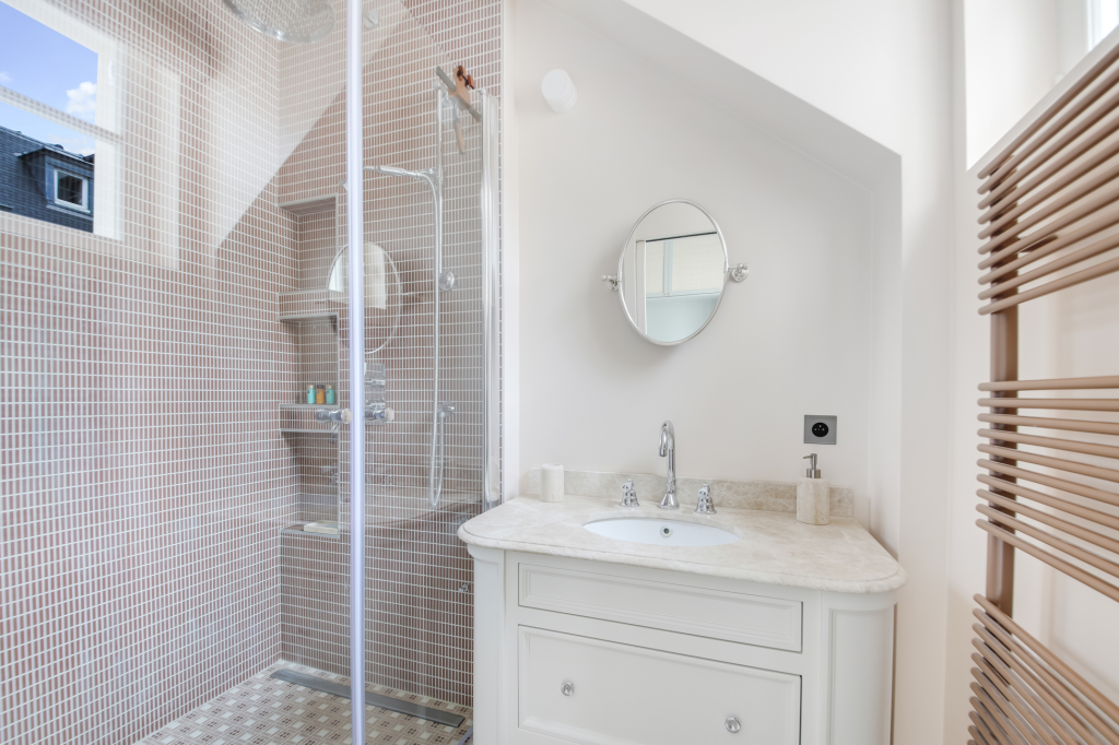 La première, accessible depuis la chambre master, est équipée d'une douche à l'italienne. La seconde dispose d'une grande baignoire. L'appartement dispose également de deux toilettes séparées.