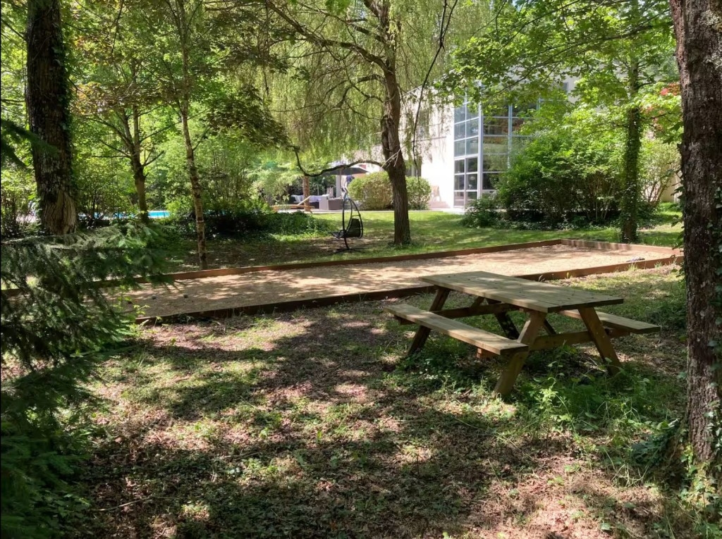 sur 3000m2 d'un jardin à l'anglaise arboré avec terrain de pétanque et table de pingpong.