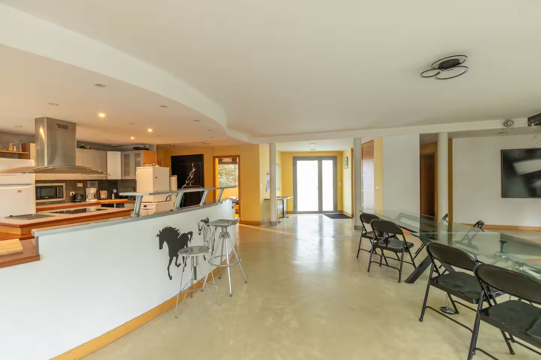 au rez de chaussée une grande pièce de 100m2, ouverte sur l'exterieur par 3 baies vitrées, réunie le salon cathédrale (avec 8 m de hauteur sous plafond), la salle a manger et la cuisine ouverte.