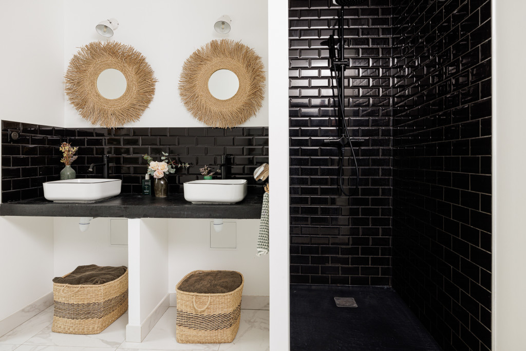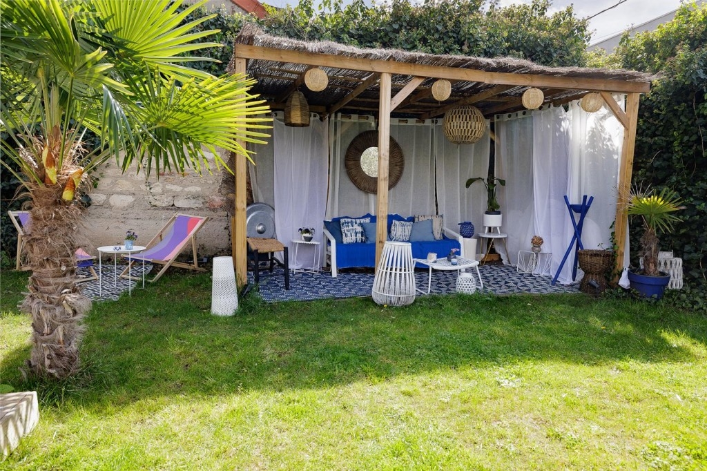 Au 2e étage , on trouve une chambre avec une salle de bain, qui donne sur une terrasse aménagée .