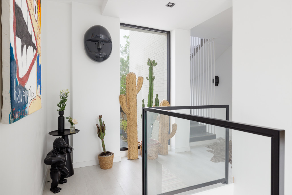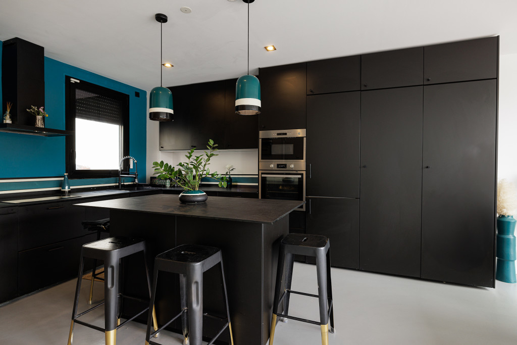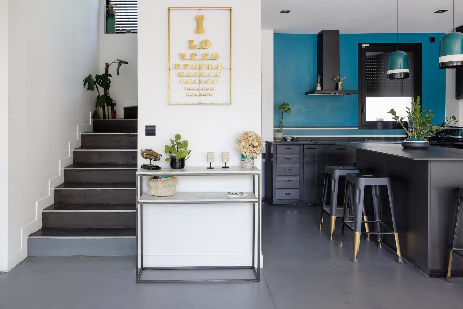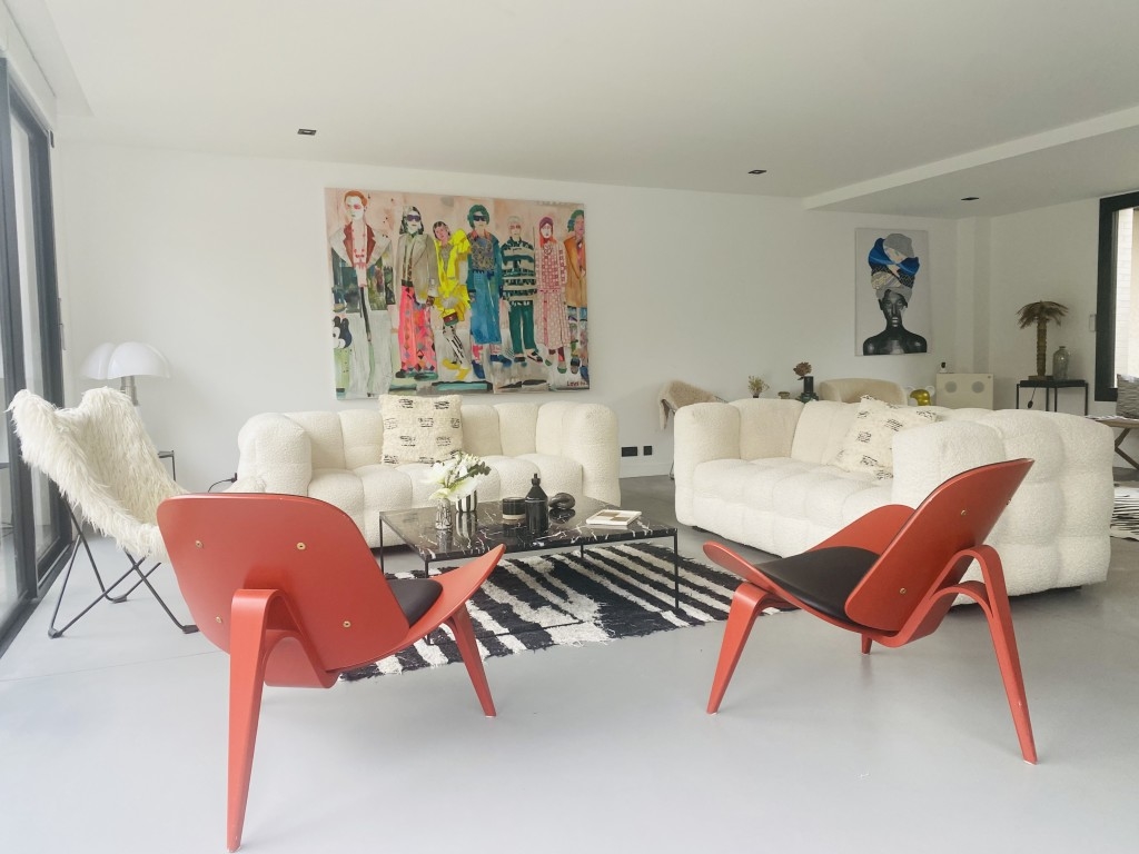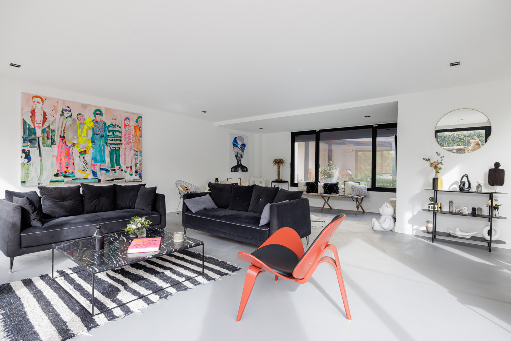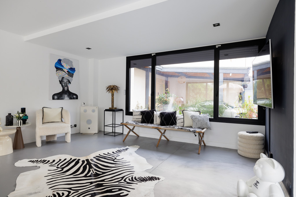 Les volumes intérieurs ont été conçus pour répondre aux exigences des équipes créatives. Les espaces de vie — séjour, espace repas et cuisine — s’ouvrent sur une superficie d’environ 110 m², organisée autour d’un îlot central et offrant de multiples perspectives .