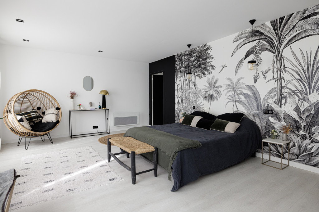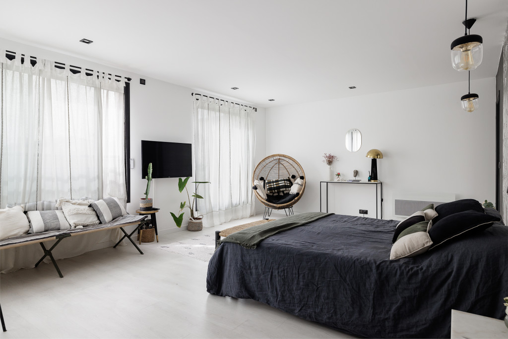 Au 1er l’étage, une suite parentale (grande chambre + grande salle de bain avec baignoire ilot) de près de 50 m² peut accueillir des prises de vue, ainsi qu'une 2e chambre avec une salle d'eau, et un petit bureau.