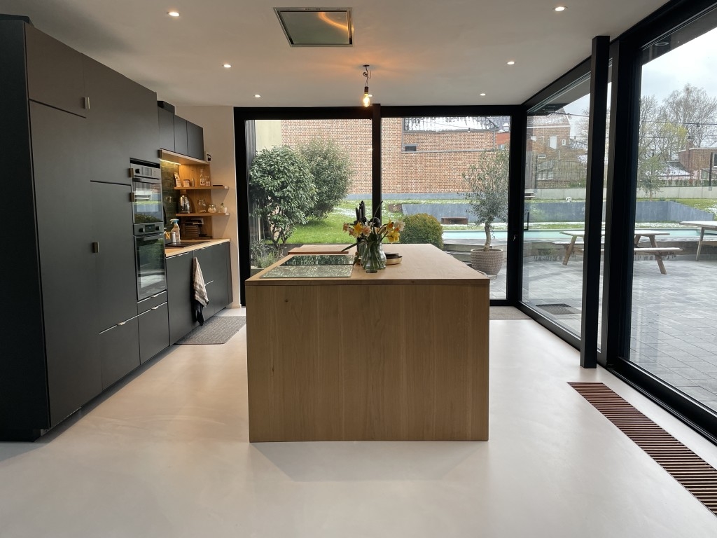 Cuisine ouverte sur un salon/salle à manger avec grande cheminée, entièrement tournée vers l'extérieur par de grandes baies vitrées.