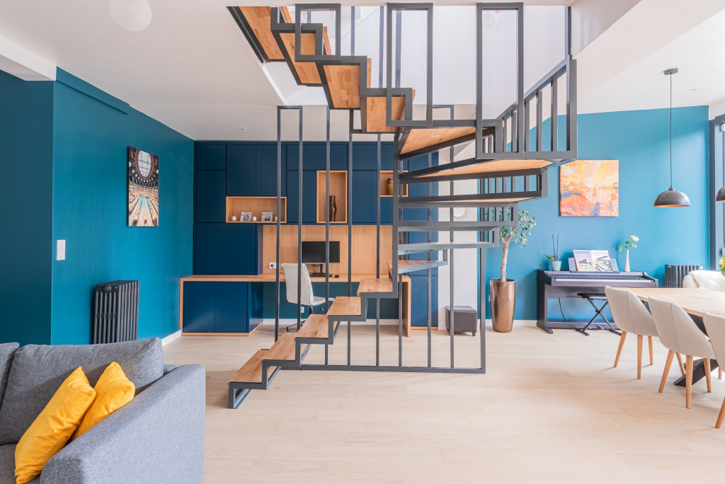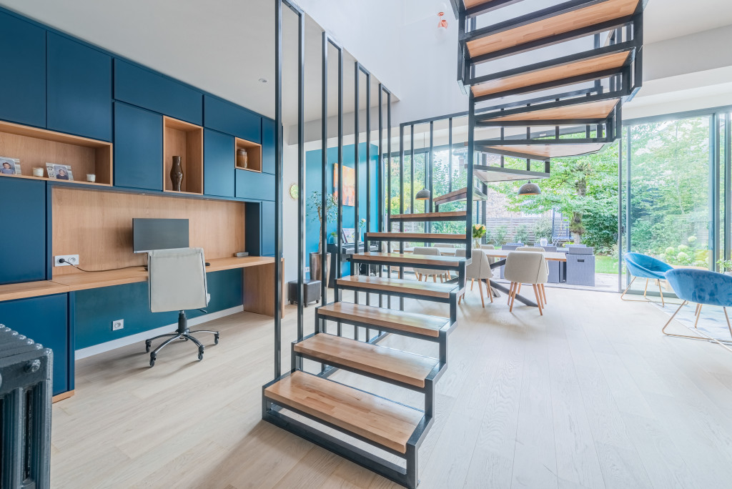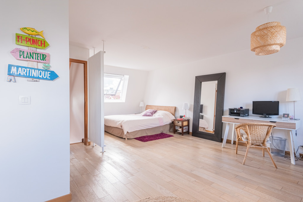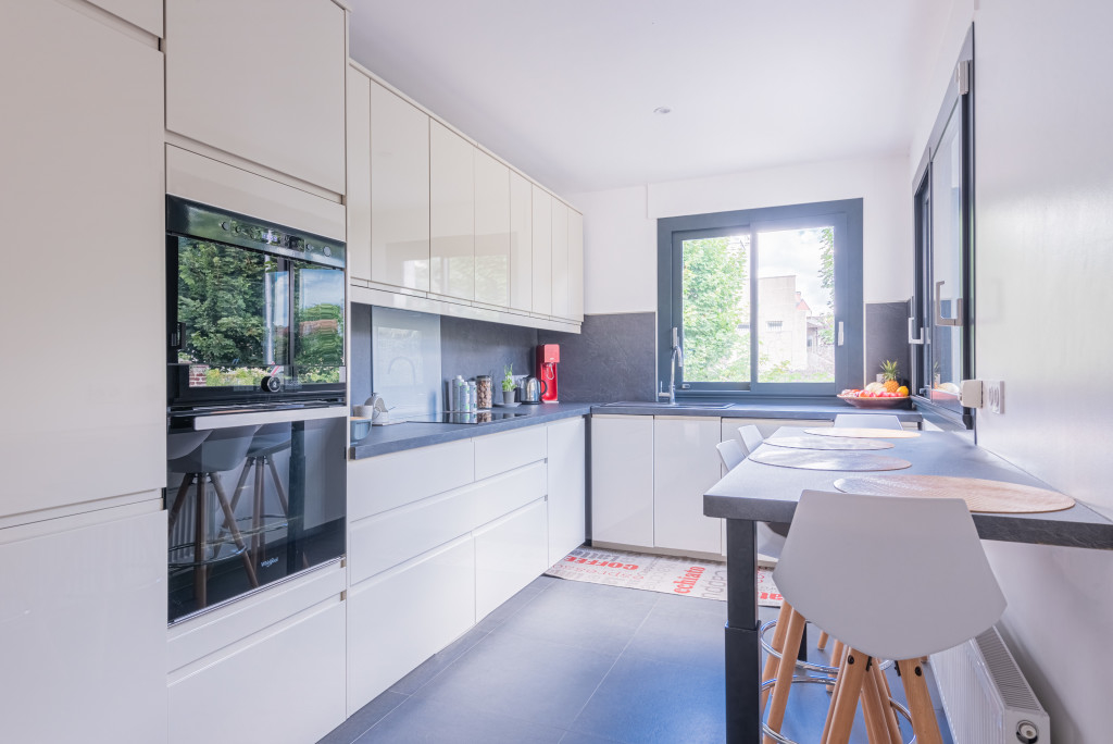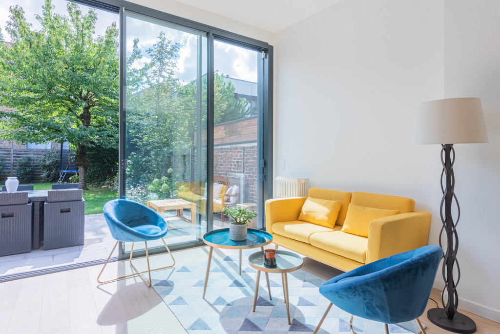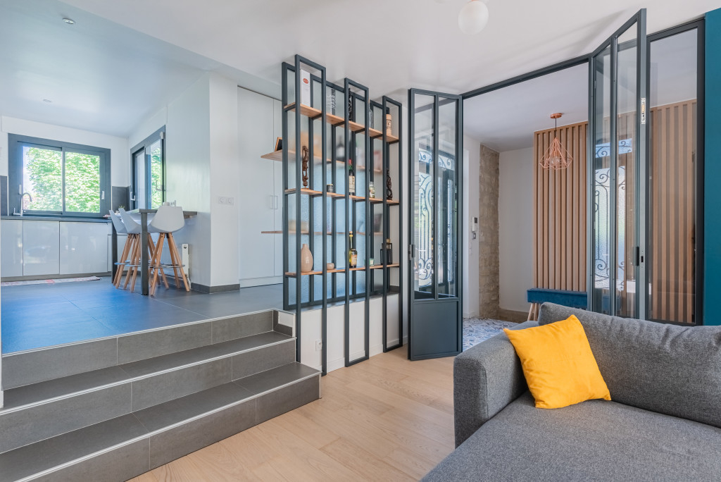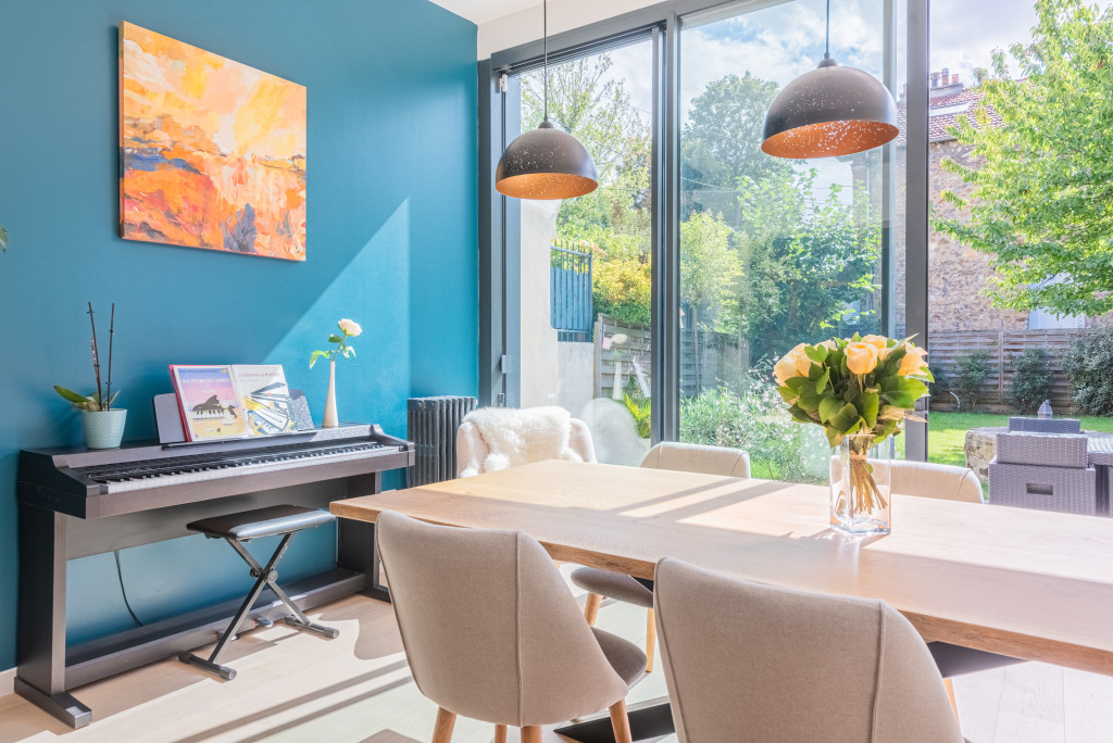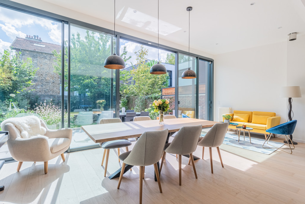 • Un vaste espace ouvert et baigné de lumière grâce à de grandes baies vitrées donnant sur le jardin.